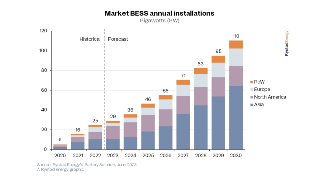 “This is a shift from current trends, as the projected installation at the end of 2023 is expected to be dominated by North America, which will account for 45% of total BESS capacity,” says Rystad Energy.
