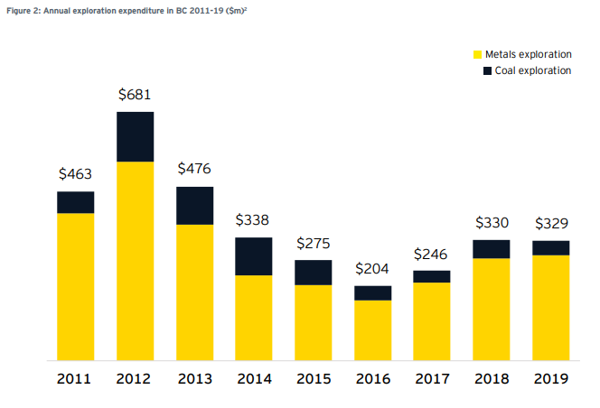 The positive momentum gained in British Columbia from mineral and coal exploration expenditure between 2016 and 2018 flattened out in 2019, according to the British Columbia Mineral and Coal Exploration Survey.