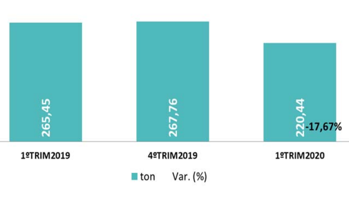 Brazil’s total mineral production fell 17% — 147 million tonnes — in the first three months of 2020 compared to the same period last year, the Brazilian Mining Association (Ibram) reported.