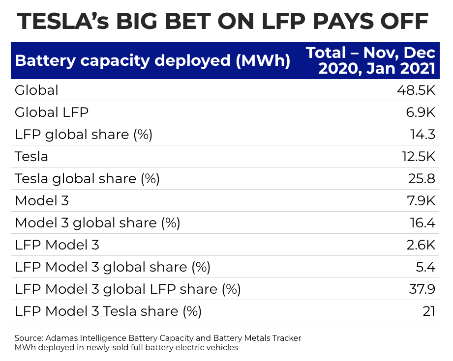In December, only its second full month of sales, the 55KWh LFP-battery Tesla Model 3 captured 5.9% of the global full electric car market in terms of battery capacity deployed despite not being for sale in the US, according to data supplied by Adamas Intelligence.