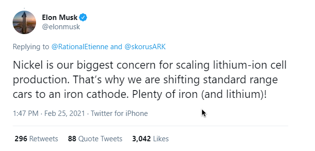 Tesla CEO Elon Musk has expressed worry about nickel supply on a few occasions in recent months and last week touted LFP as the future for “standard range” Teslas.