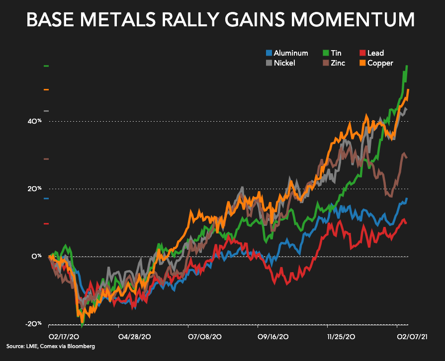 Other industrial metals also jumped, with aluminum at its highest since 2018, nickel its strongest since 2014, tin its strongest since 2012 and lead its highest since 2019.
