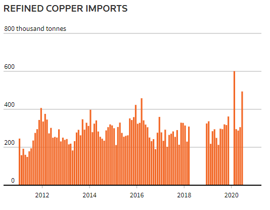 The first two months of 2021 saw imports unwrought copper of 884,009 tonnes, up 4.65% from the same period in 2020.