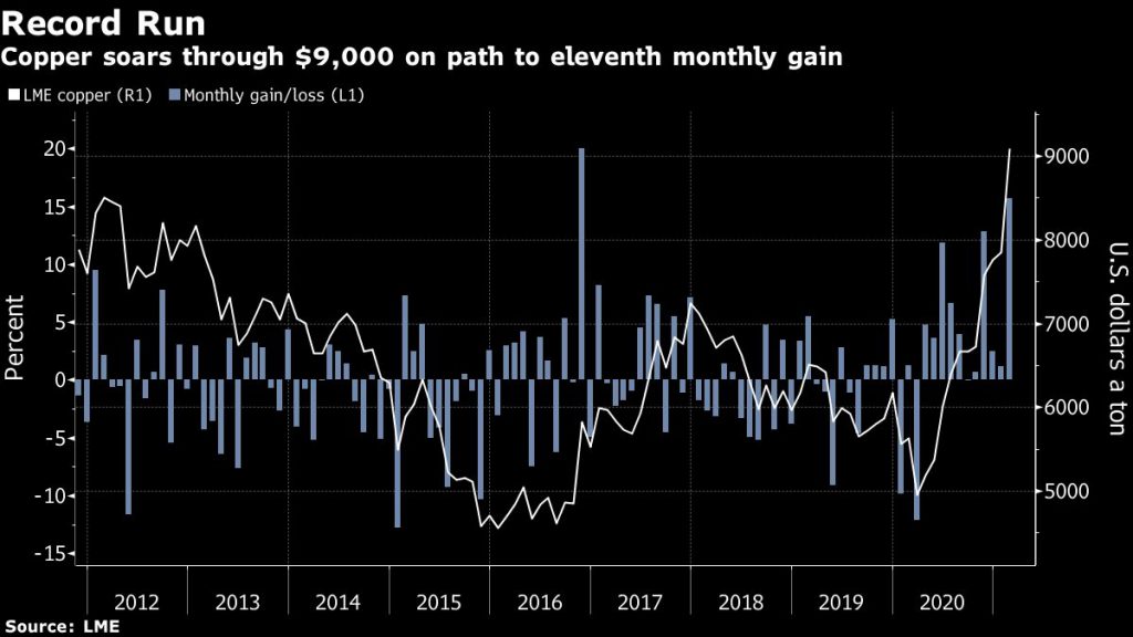 Investors are also piling into copper on a bet that demand will surge in the coming years, as governments worldwide unleash unprecedented stimulus programs targeting renewable energy and electric vehicles, which will require huge volumes of the metal.