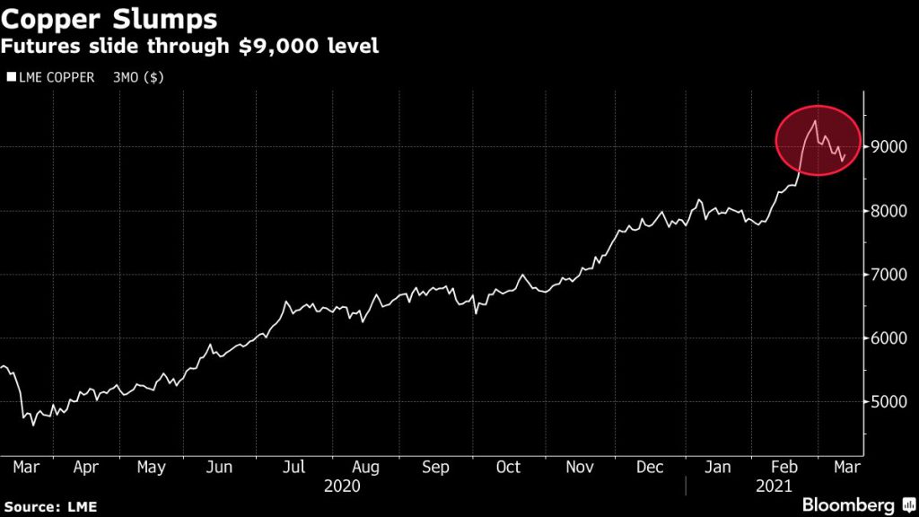 Copper surged to the highest in almost a decade last month on strong Chinese buying and as investors poured into commodities on the prospect that vaccinations and stimulus would unlock a sharp global recovery. Since then, futures have retreated about 6% as the dollar and bond yields rose.