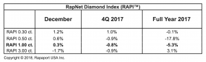 The steady December performance, however, doesn’t reflect the overall 2017 behaviour as the 1-carat RAPI softened 0.8% in the fourth quarter and fell 5.3% for the full year, while the index declined for the sixth consecutive year in 2017.