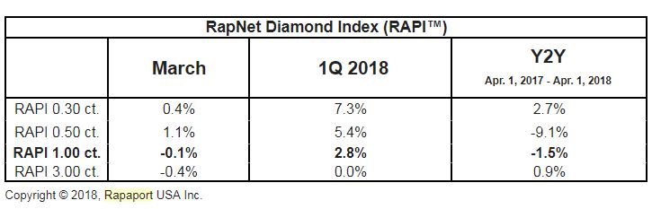 “The RapNet Diamond Index (RAPI™) for 1-carat diamonds slid 0.1% in March. RAPI for 0.30-carat stones went up 0.4%, while RAPI for 0.50-carat grew 1.1%. RAPI for 3-carat diamonds declined 0.4% during the month. RAPI for 1-carat stones rose 2.8% during the first quarter,” the document reads.