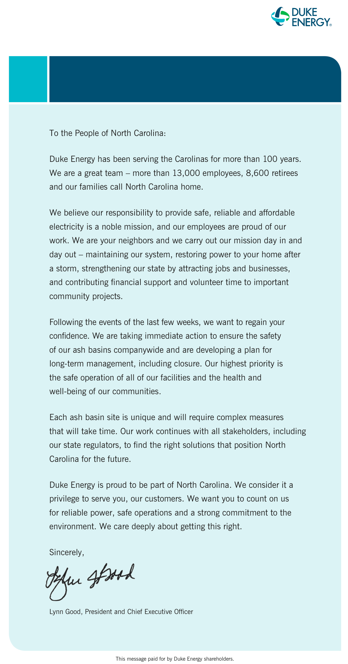 Taking a full-page ad in local newspapers Sunday (see below), the company said it is setting in motion actions to “ensure the safety of our ash basins and develop a plan for long-term management, including closure.”