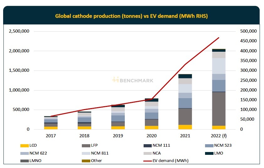 Driven by advances in battery packs to overcome some of the drawbacks of the chemistry in terms of energy intensity, LFP’s overall cathode market share has climbed from 23% in 2017 to nearly 42% this year, according to Benchmark data.