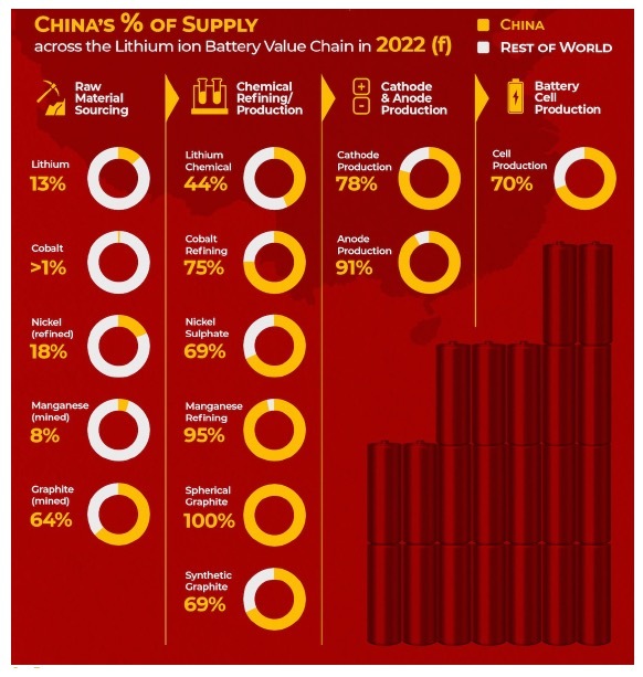 China controls 78% of global output of cathodes (the figure for anodes is 91%) and 70% of the world’s cell production.