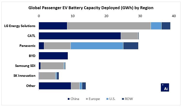 LG Energy Solution (battery spin-off from LG Chem) took the top spot in 2020 by passenger EV battery capacity deployed onto roads, thanks in large part to its supply agreement with Tesla in China, coupled with its broad book of clients in Europe, including VW, Renault and Mercedes, among others.
