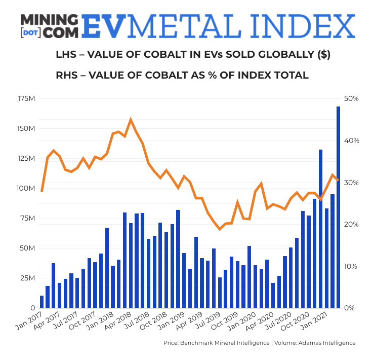 MINING.COM’s EV Metal Index set a new record in March with a surge in overall deployment more than offsetting a pullback in the price of cobalt and nickel used in the battery supply chain.