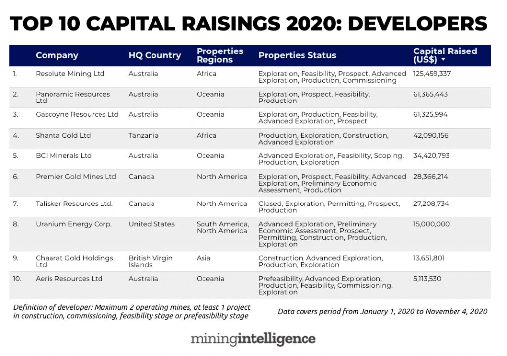 Using data provided by Miningintelligence, MINING.COM listed the top ten mine developers that have raised significant amounts of capital since the beginning of the year (up to November 4, 2020).