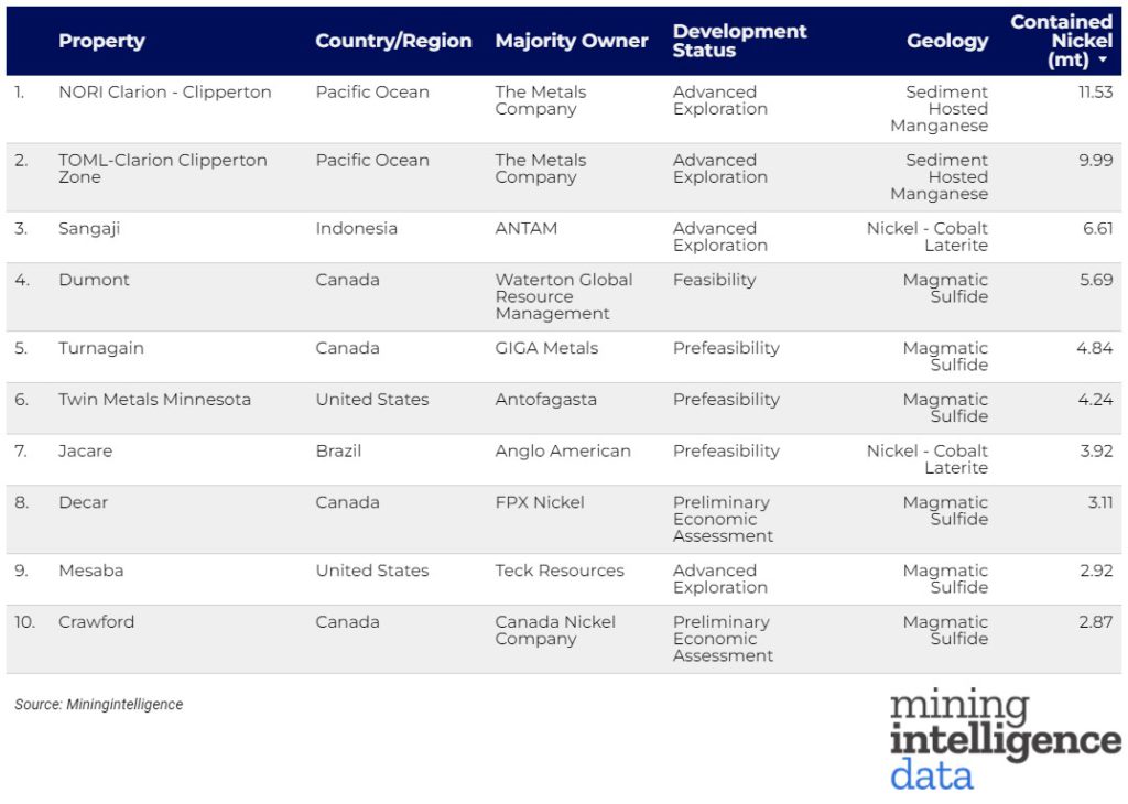 To identify major nickel deposits that could form part of the global supply landscape in the future, MINING.COM and sister company MiningIntelligence compiled the 10 largest projects under development worldwide and ranked them based on contained nickel resources in the measured, indicated and inferred categories.