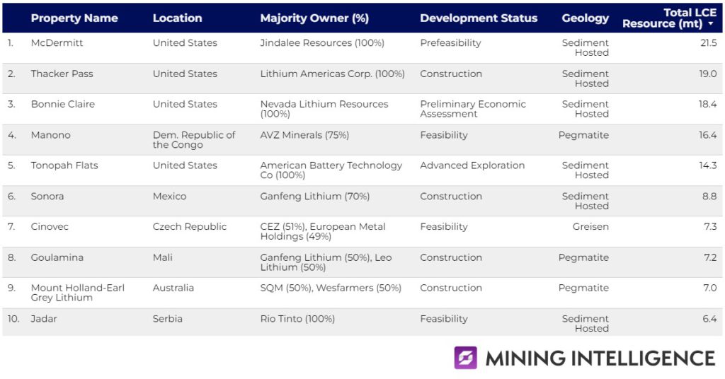 Topping the list is the McDermitt project, located on the Nevada-Oregon border in the US and owned by Jindalee Resources. The Australian miner this year updated the resource to 21.5 mt LCE, up 65% from the 13.3 million tonnes reported last year.