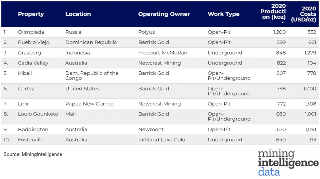 Taking top spot is Polyus’ largest mining operation, Olimpiada, located in one of Russia’s most prolific gold mining provinces. The mine began production in 1996 and currently accounts for nearly half of the Moscow-based company’s total gold output. Even though production in 2020 was impacted by a decline in ore grades processed, resulting in a 14% y-o-y decline, Olimpiada claimed the number 1 spot.