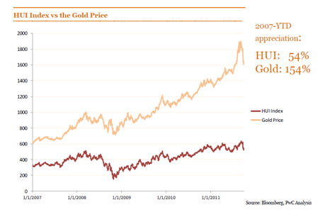 What puts this in perspective is the wide gap that still exists between bullion and the stock values of the major gold miners. Compared to the price of gold which has rocketed 154% since 2007, the performance of the HUI Index (NYSE:HUI), a weighted basket of unhedged gold stocks, has lagged considerably.