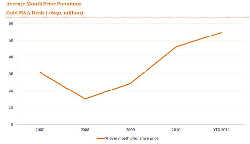Year to date, there have been 429 acquisitions of gold companies worth approximately $12.5 billion and YTD volumes and values are 18% and 13% higher than the first nine months of 2010. Activity levels and the money involved are also already at annual 2009 levels and have surpassed the totals for 2006, 2007 and 2008. That is despite the fact that 2007 was an all-time M&A peak in the broader market.