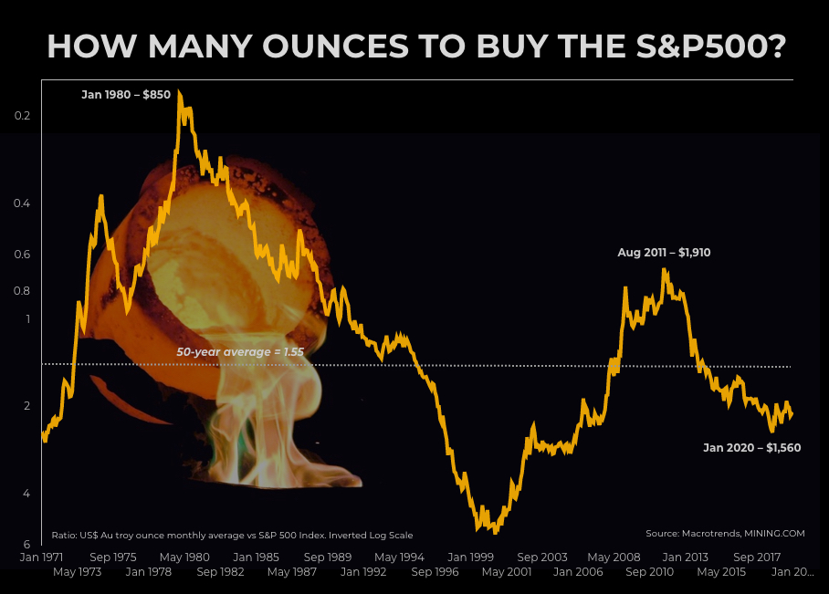 Today, you need just over two ounces to buy the market. The ratio of the gold price and the S&P index of the 500 largest stocks in the US was the same in September 2007 when an ounce of gold could be picked up for less than $600.