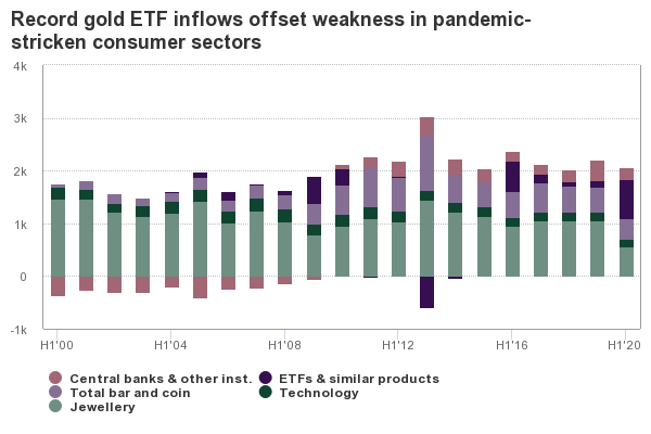 The global response to the pandemic has also fuelled record-breaking flows into gold-backed ETFs and brought total holdings to 743 tonnes for H1 2020, more than any other annual year.