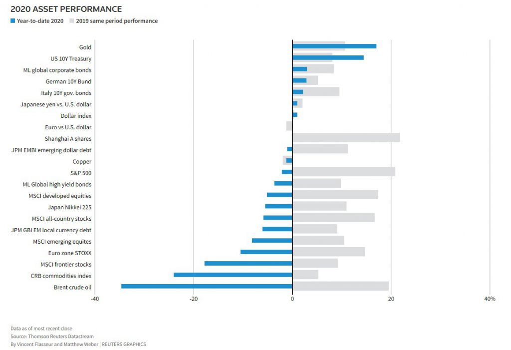 Bullion is up nearly 35% so far this year and is one of the best-performing assets in 2020. The precious metal is benefiting from heightened uncertainty around the long-term effects of the global health crisis, as more investors turn to safe-haven assets and an alternative store of value in a low-yield environment.