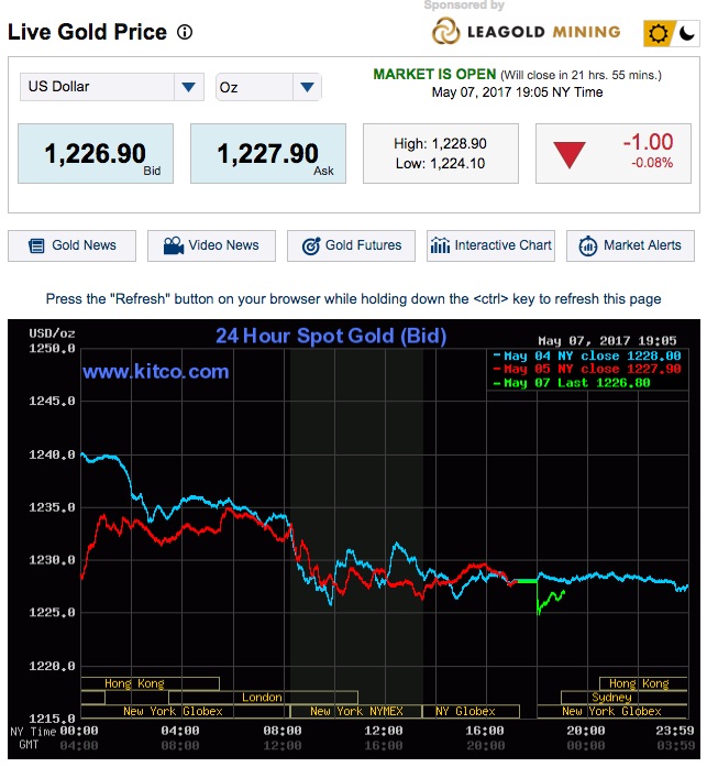 Gold is trading slightly down from its Friday spot price close of $1,227.90, as investors digest the outcome of the recently-decided French presidential election.