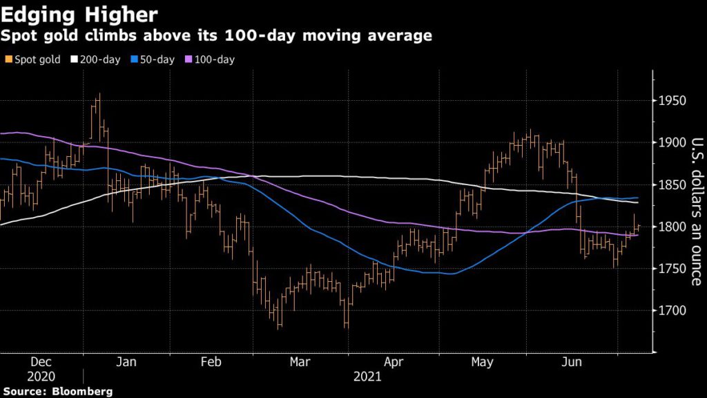 Spot gold rose 0.3% to $1,802.74 per ounce by 11:40 a.m. ET, after jumping to its highest level since mid-June at $1,809.27 earlier. US gold futures were up 0.4% to $1,802.20 per ounce in New York.