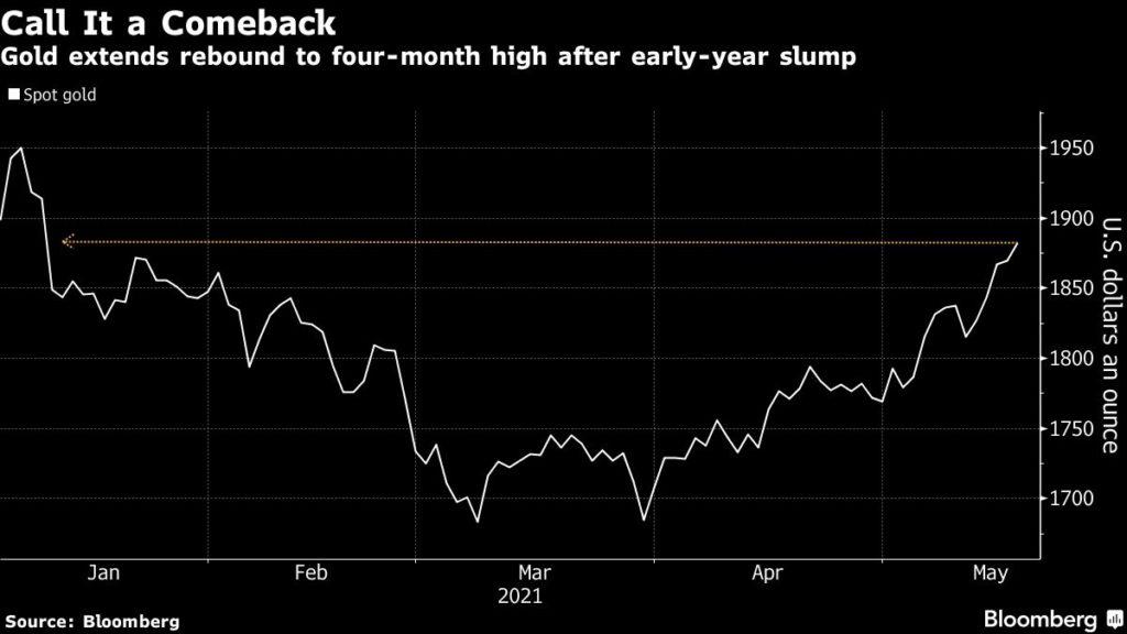 Spot gold rose as much as 1.1% to $1,890.13 an ounce, the highest since the first week of January, before trading at $1,883.41 at 11:50 p.m. ET. US gold futures also gained 0.9%, trading at $1,885.70 an ounce in New York.