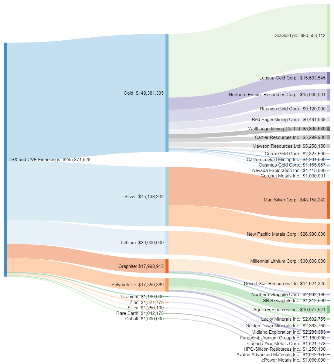 The largest financing was SolGold at $80.5 million followed by Mag Silver at $48.1 million.