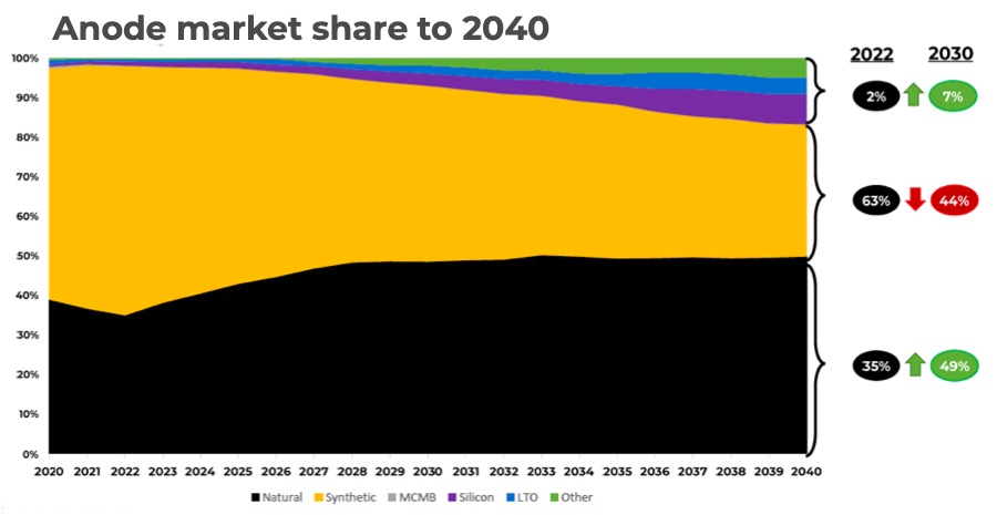 While synthetic anodes are currently more sought after by carmakers because they improve charging times and battery life, natural graphite-heavy anodes will find favour in future, boosted also by the increasing addition of silicon to anode chemistries.