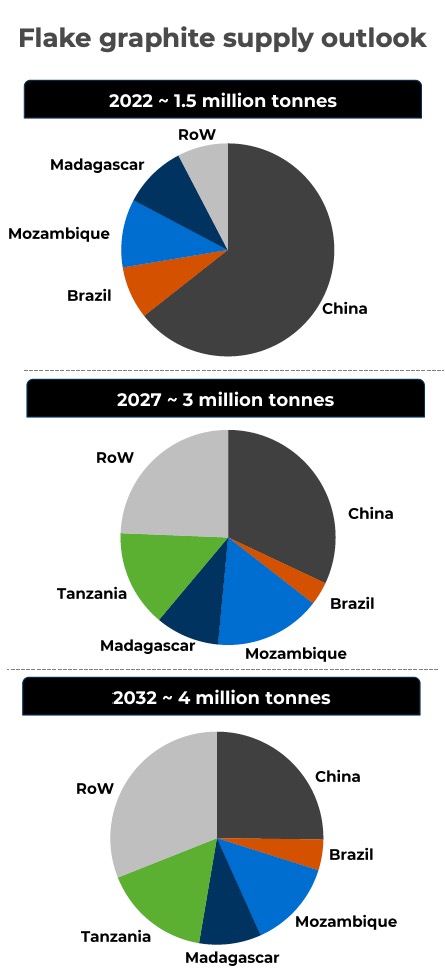 Benchmark estimates global this year’s flake graphite supply of roughly 1.5m tonnes will double by 2027 driven by new mines and expansions in Tanzania, Mozambique, Madagascar and Namibia.