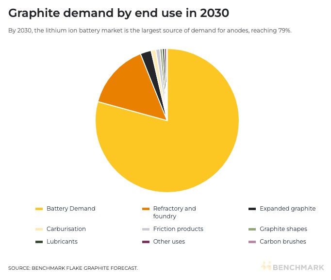 This year refractories and foundries will still dominate demand, but by 2025, the battery industry is set to consume two thirds of the world’s flake graphite, increasing to 79% in 2030, according to Benchmark’s Natural Flake Graphite Forecast.