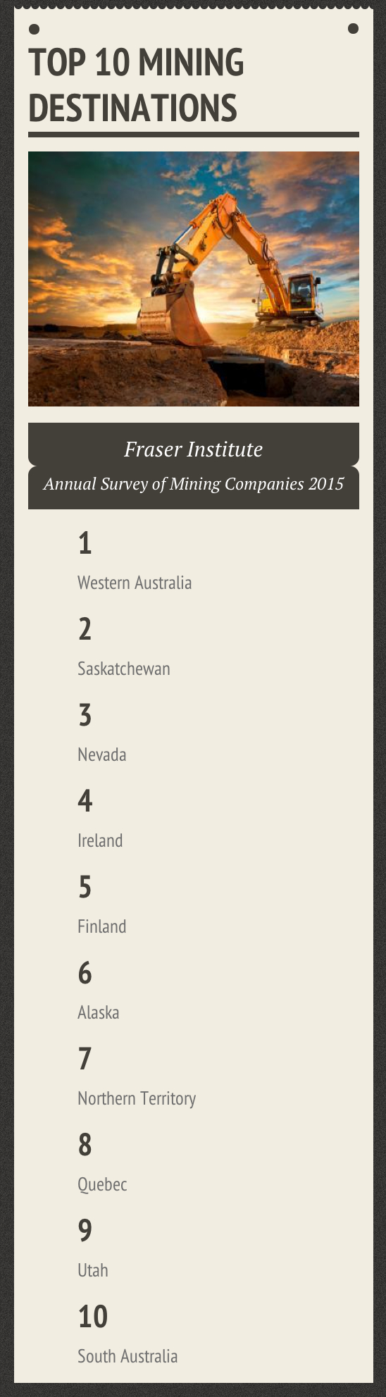 The Fraser Institute’s Annual Survey of Mining Companies 2015, rates 109 jurisdictions around the world based on their geologic appeal and the extent to which government policies encourage exploration and investment.