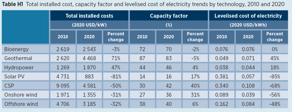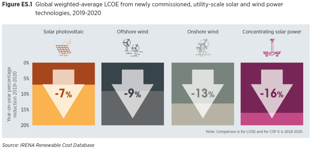 The global weighted-average levelized cost of electricity from new capacity additions of onshore wind declined by 13% in 2020, compared to 2019, while the LCOE of offshore wind fell by 9% and that of utility-scale solar photovoltaics by 7%