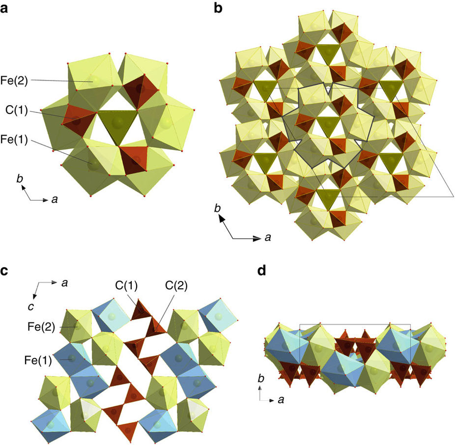 (a,b) Tetrairon(III) orthocarbonate Fe4C3O12 and (c,d) diiron(II) diiron(III) tetracarbonate Fe4C4O13, at ambient temperature and 74(1) and 97(2) GPa, respectively. In a, three FeO8 bicapped prisms (light green) and three CO4− tetrahedra (brown) form a ring with threefold symmetry by corner and edge sharing. The rings form layers that are stacked along the c axis. FeO6-prisms (dark green) are connected by triangular bases and located in the channels created by the rings. In b the overall structure of the orthocarbonate is displayed along the c-axis. In c FeO8 bicapped prisms (light green) are connected in a 3D framework by dimers of edge-shared FeO7 monocapped prisms (blue) and zigzag-shaped C4O1310−chains (brown) shown along the b axis. In d the tetracarbonate structure is displayed along the c axis. Source: Nature Communications.