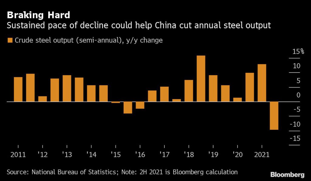 Prices have more than halved since peaking in May as the world’s biggest steelmaker intensifies production curbs to meet a target for lower volumes this year, and a sharp downturn in China’s property sector impacts demand.