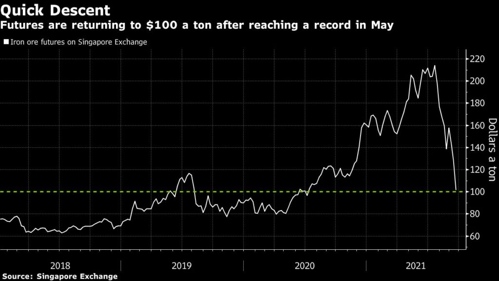 Iron ore futures have slumped more than 20% this week and were trading at $99.55 a tonne Friday morning in New York.