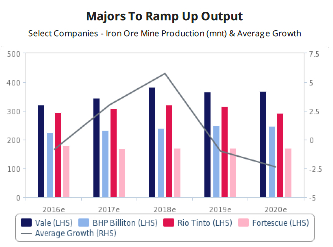 Global number one, Vale, will drive production growth in the South American nation with the low-cost S11D and Itabiritos projects. S11D’s nameplate capacity is a whopping 90m tonnes per year. The Rio de Janeiro-based firm remains on track to produce 360­–380m tonnes in 2017 and over 400m tonnes next year, accounting for over 80% of Brazil’s total output. The country exports 90% of total production.