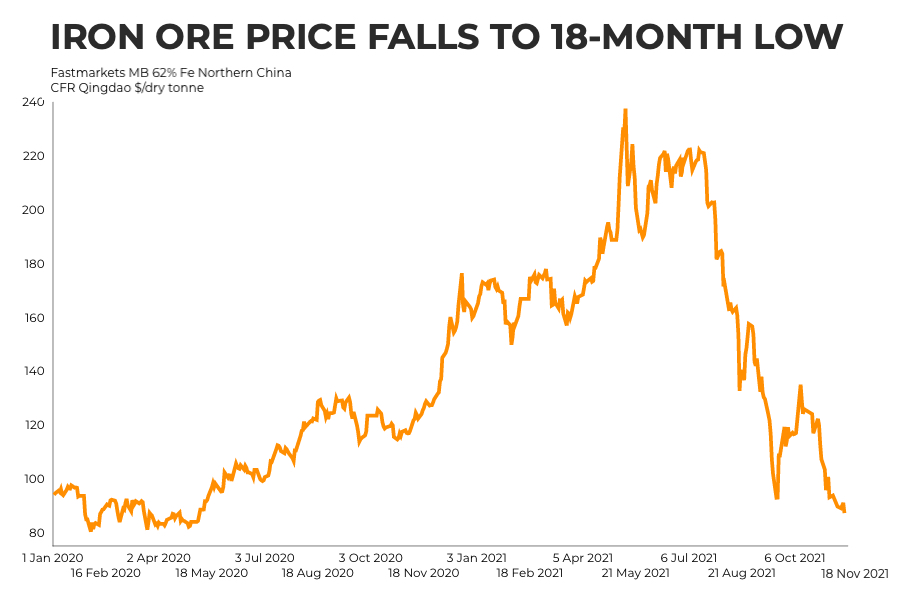 According to Fastmarkets MB, benchmark 62% Fe fines imported into Northern China were changing hands for $87.27 a tonne, down 4% from Wednesday’s closing, the lowest since May 2020.