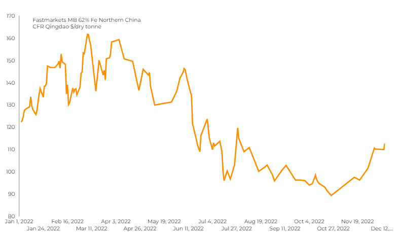 According to Fastmarkets MB, benchmark 62% Fe fines imported into Northern China were changing hands for $112.71 a tonne Thursday morning, up 2.5%.