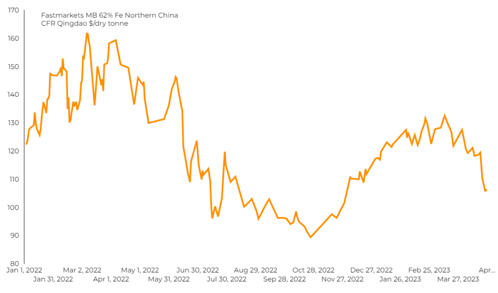 Benchmark 62% Fe fines imported into Northern China fell 0.7%, to $101.58 per tonne, the lowest since November 2022.