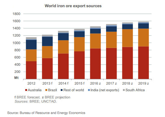 Over the next five years Australia’s iron ore exports are projected to increase at an average annual rate of 5% and total 900 million tonnes in 2019.
