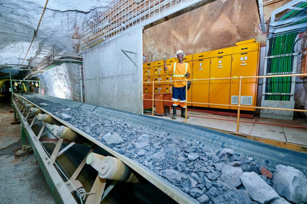 Electrician Ndala Ferdinand inspecting equipment beside Kipushi’s 1,200-metre conveyor. Credit: Ivanhoe