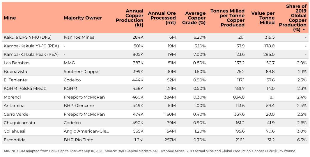 BMO points out that the Kamoa-Kakula preliminary economic assessment (PEA) only processes 5–35% of annual tonnage and at a grade 4-5 higher than the other large producers: