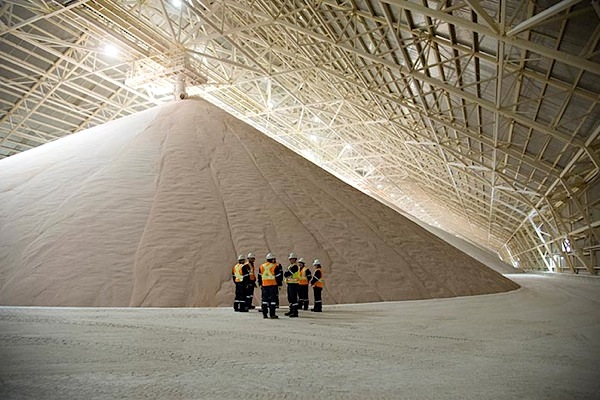 Workers near a stockpile at Potash Corp.’s Rocanville potash mine in southeast Saskatchewan. (Image courtesy of Potash Corp)