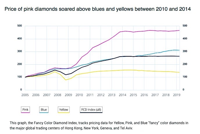 Average price for pink, yellow, blue and green stones has risen consistently by 12% a year over the last few decades, driven by consumer demand for the exotic and unusual