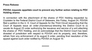 State-owned Petróleos de Venezuela SA or PDVSA announced on Twitter that it filed an appeal requesting that a Delaware court vacate a decision made public on August 23 granting Canadian miner Crystallex the right to seize its U.S. assets.