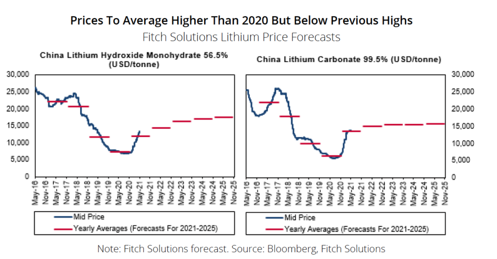 “Within Li-ion batteries, lithium’s use in batteries featuring varying cathode chemistries will help insulate lithium demand from technological advances and coinciding changing preferences for cathode chemistries,” Fitch forecasts.