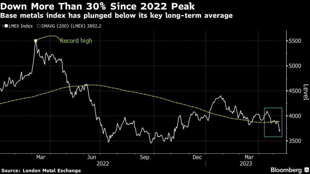 The London Metals Exchange Index — a gauge for the six main metals traded on the bourse — has tumbled more than 30% since its record high in 2022.