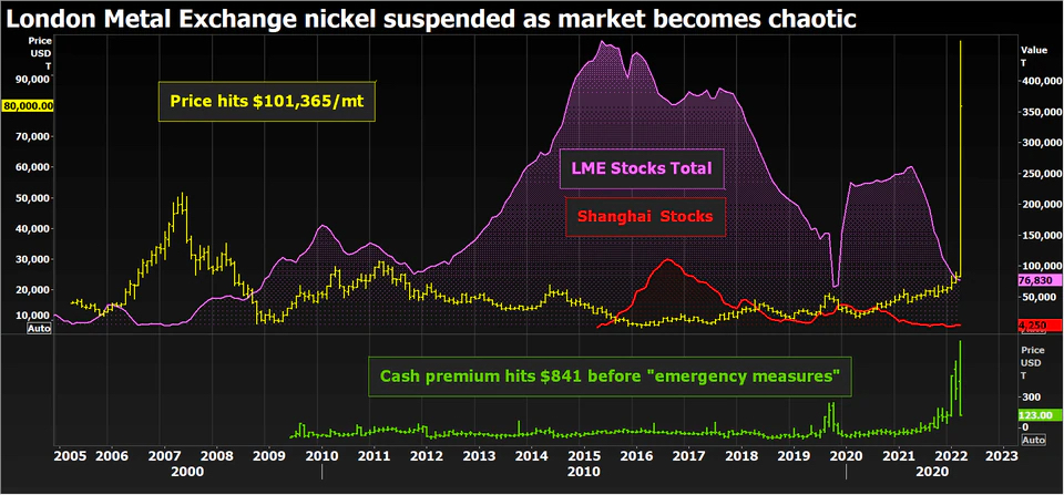 Bloomberg reported in February on the squeeze in the nickel market, suggesting a single mystery stockpiler had amassed over 50% of all LME nickel inventories representing around 43,000 tonnes, nominally worth some $3.4 billion at $80,000 per tonne. Nickel was trading in the low $20,000s in January.